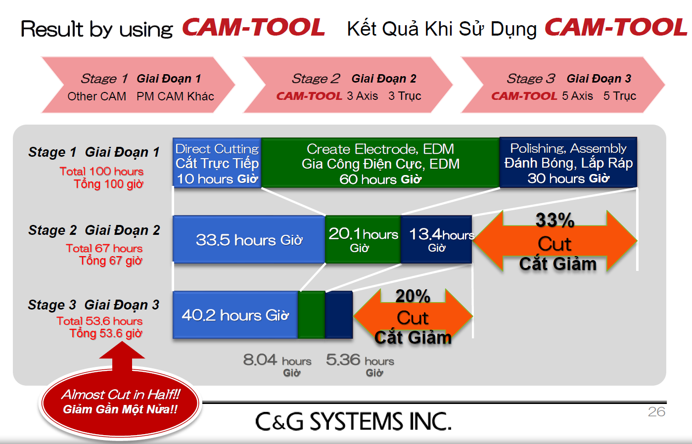 Với những phần mềm CAM khác, thời gian cắt ngắn hơn nhưng các bước hoàn thiện sau sẽ mất nhiều thời gian hơn khiến tổng thời gian cao hơn gần gấp đôi so với khi dùng CAM-TOOL.
