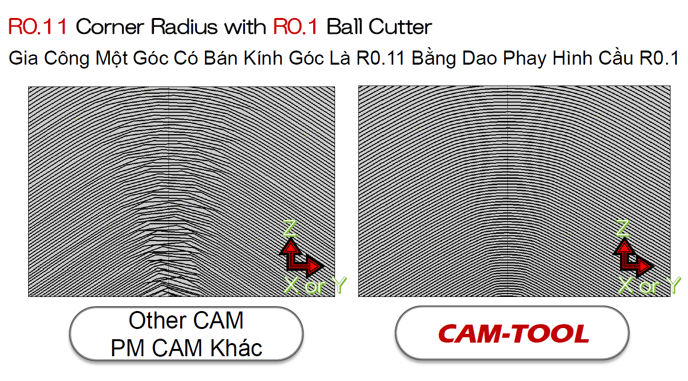 Trong hình minh họa này, 2 phần mềm CAM cùng xử lý một đường chạy dao gia công một góc có bán kính góc là R0.11 bằng dao phay hình cầu R0.1.