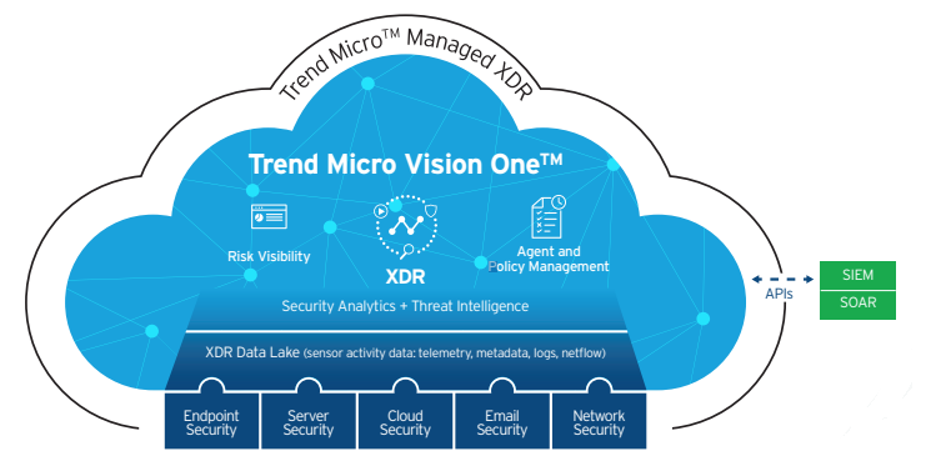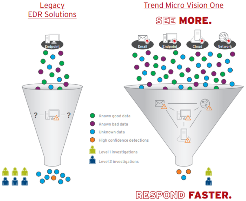 Trend Micro Vision One cung cấp các khả năng XDR tiên tiến thu thập và tự động liên kết dữ liệu trên nhiều lớp bảo mật; email, điểm cuối, máy chủ, khối lượng làm việc đám mây và mạng. Trend Micro ngăn chặn phần lớn các cuộc tấn công bằng cách cung cấp bảo vệ tự động. Lớp bảo vệ này, kết hợp với các khả năng XDR liên kết hoạt động mối đe dọa trên các lớp, cho phép phát hiện nhanh chóng các cuộc tấn công phức tạp mà vượt qua phòng ngừa. Điều này cung cấp một phương pháp an ninh cân bằng vì các nhóm có thể nhanh chóng nhìn thấy câu chuyện về một cuộc tấn công và phản ứng nhanh hơn và tự tin hơn. Khả năng hiển thị và hiệu suất mà Trend Micro Vision One cung cấp làm cho đội bảo mật làm việc hiệu quả hơn, cho phép họ làm được nhiều hơn với ít công sức hơn. Ngoài ra, dịch vụ Trend Micro™ Managed XDR có thể bổ sung cho đội ngũ với các hoạt động săn lùng và điều tra mối đe dọa.