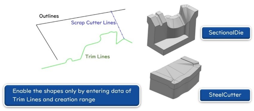 - Với mođun này, người dùng có thể thực hiện nhanh chóng và chính xác việc tạo các biên dạng đặc trưng của quá trình tạo hình khuôn dập, xác định chính xác lượng biến dạng dự kiến của chi tiết, xác nhận độ lệch của trọng lượng rỗng và lập ra một mô hình mới tương tự bằng cách sử dụng lượng biến dạng dự kiến, đặc tính của vật liệu cần chế tạo và mô hình 3D đã có hoặc liệu thiết kế STL.