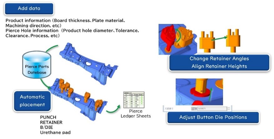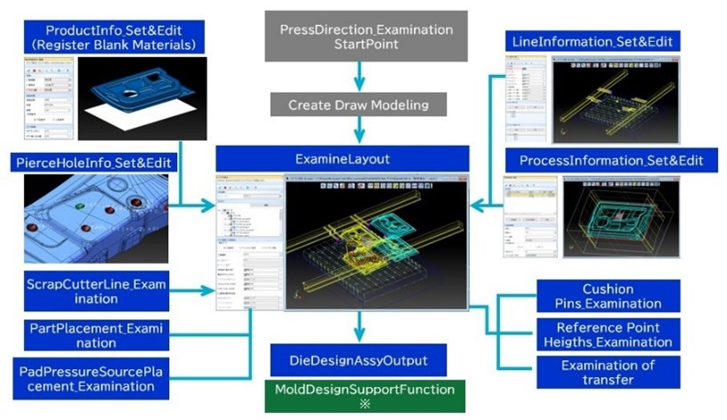 - Các chức năng hỗ trợ để kiểm tra các yếu tố liên quan đến quá trình sản xuất sản phẩm khuôn dập, và chuyển đổi sang dữ liệu CAD 2D: